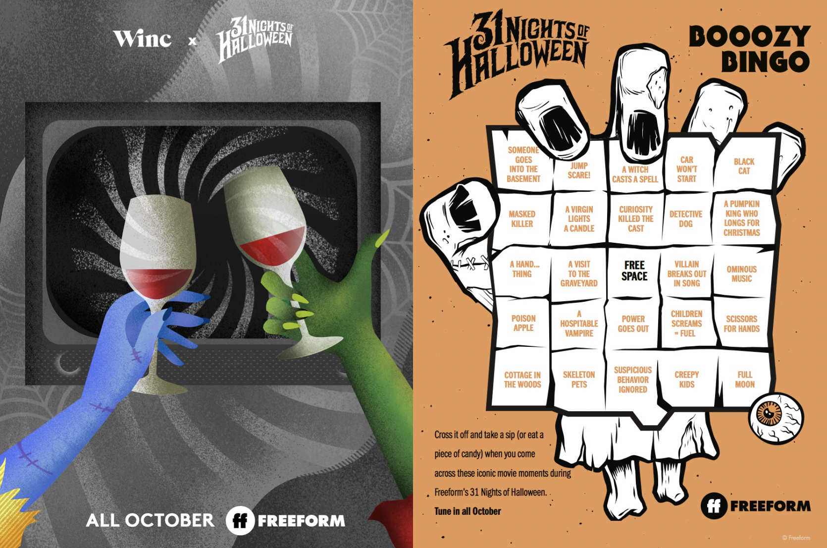 Winc partnered with Freeform during the month of October for a Halloween campaign. Winc wines were paired with the iconic shows and movies featured in their annual 31 Nights of Halloween. The featured wines arrived in a custom Freeform branded box with this bingo game as an effort to keep customers engaged during the month-long program. Other extensions included blog posts, emails, and interactive Instagram stories.