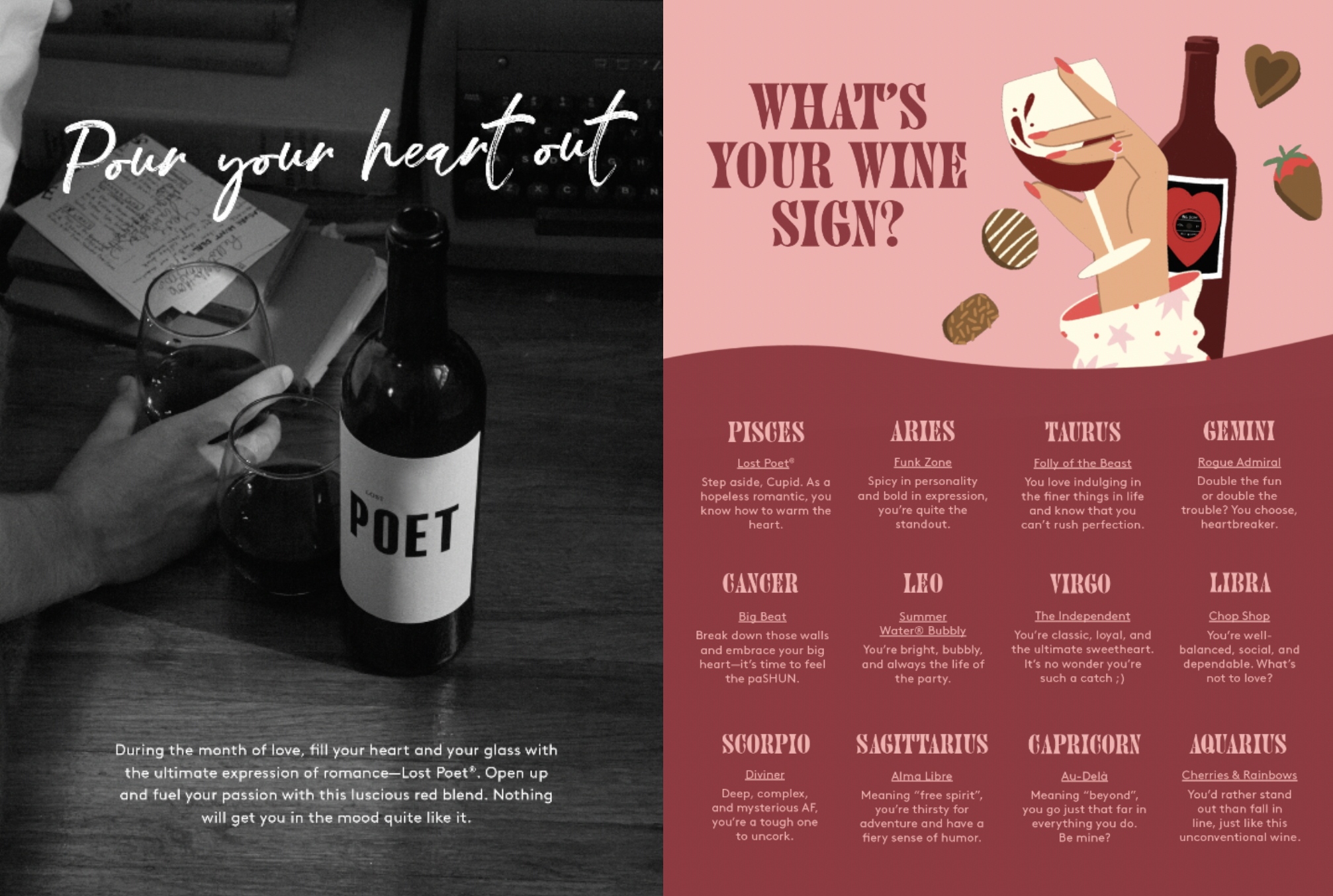 Made in partnership with NYT best-selling poet Atticus, Lost Poet is one of Winc’s core brands. It’s known for its creative and loving spirit, which makes it the perfect wine to feature during the month of love. While Lost Poet was the main merchandising focus for the month, we also personified other wines by pairing them with all 12 zodiac signs to create a fun-loving horoscope reading for all members to engage with.