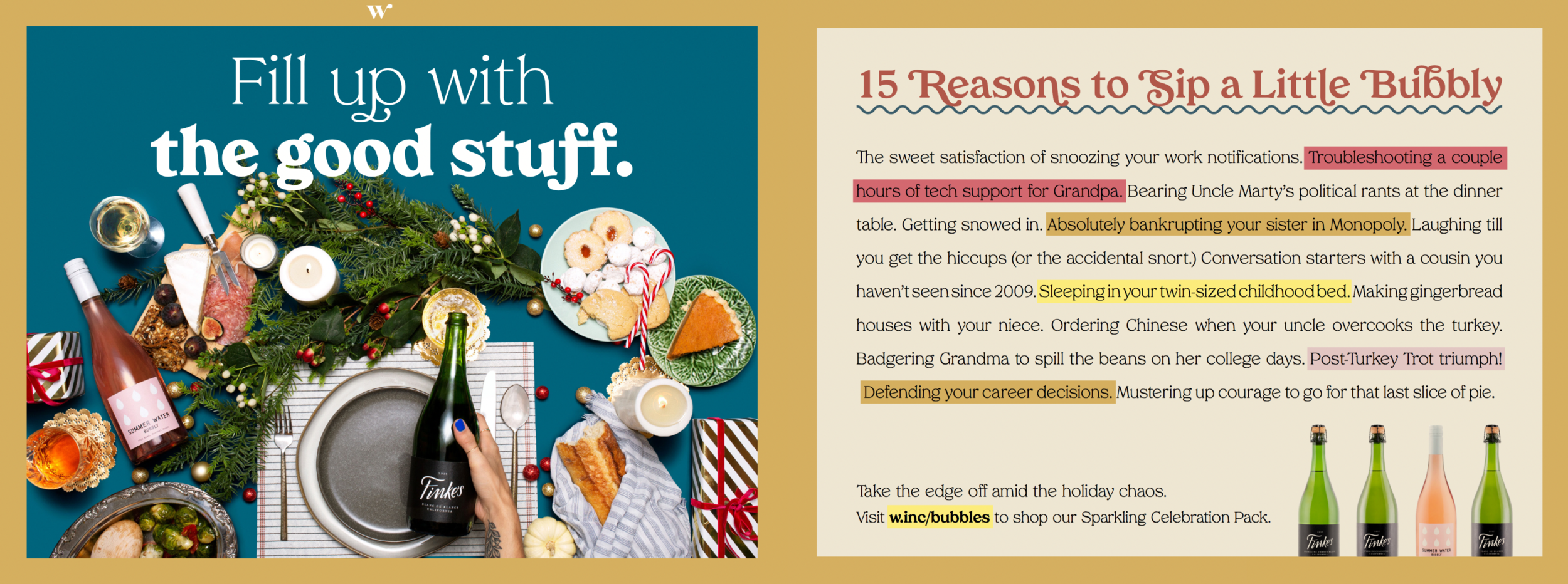 Winc’s holiday campaign Season’s Greetings focused on connectivity with friends and family from afar. In the heat of the pandemic, the holidays brought even harder times for many, forcing people to miss their favorite part of the season — togetherness. We wanted to create a way for members to spread cheer from a distance with our very own series of positive and playful holiday grams. The concept carried on for two months on social channels as well.